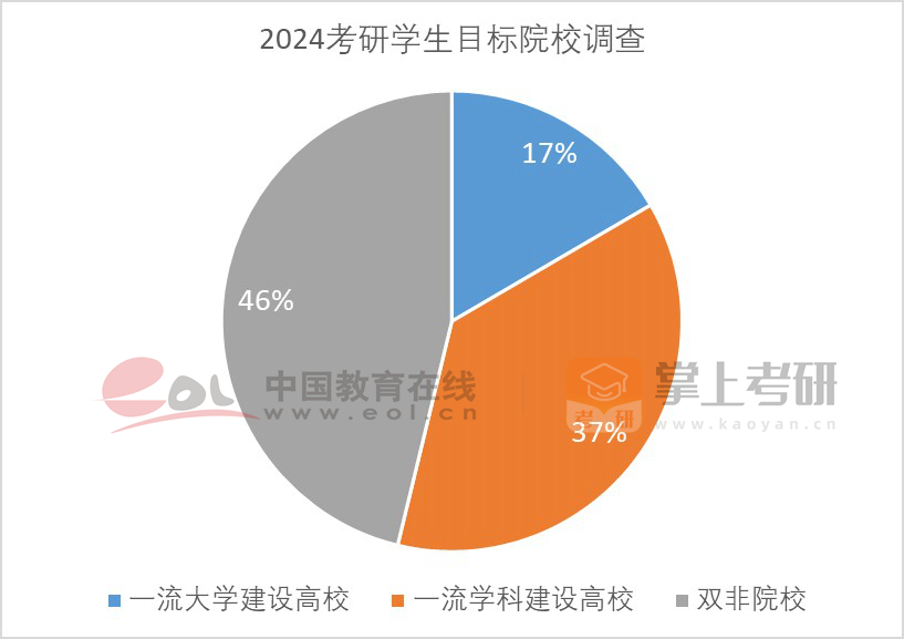此外,根據(jù)中國教育在線開展的2024年考研學(xué)生問卷調(diào)查顯示,近五成受訪者目標(biāo)院校為雙非院校,目標(biāo)院校為一流學(xué)科建設(shè)高校的占比為37%,目標(biāo)為一流大學(xué)建設(shè)高校的占比不足兩成。