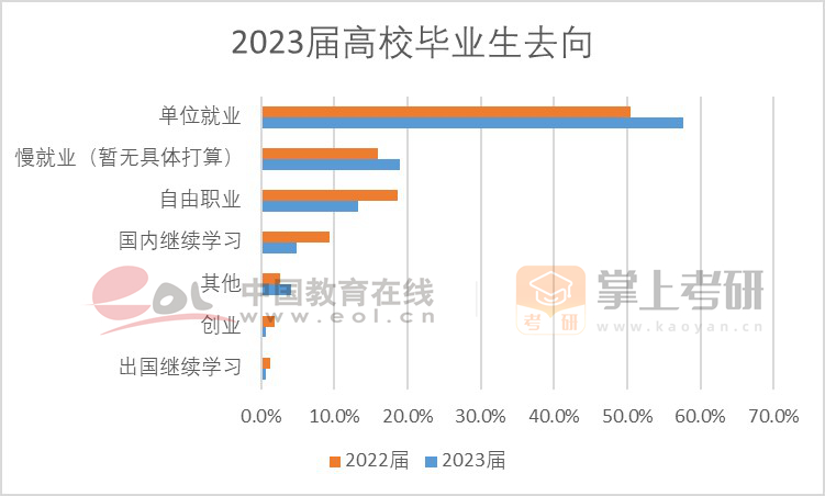 此外,根據(jù)智聯(lián)招聘發(fā)布的《2023大學(xué)生就業(yè)力調(diào)研報告》顯示, 2023屆畢業(yè)生選擇單位就業(yè)的比例從去年的50.4%上升到57.6%;選擇自由職業(yè)的比例從去年的18.6%下降到13.2%;選擇國內(nèi)繼續(xù)學(xué)習(xí)的比例從去年的9.3%下降到4.9%。