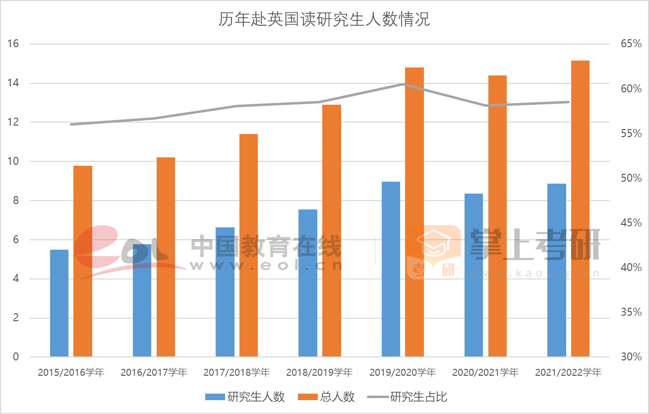 此外,根據(jù)英國高等教育統(tǒng)計(jì)局?jǐn)?shù)據(jù)顯示, 2021/22學(xué)年,中國內(nèi)地赴英就讀人數(shù)超過15萬人,其中研究生人數(shù)為8.87萬人,占比為58.51%,研究生人數(shù)同比上一年度增長了6.01%。從近年赴英讀研人數(shù)占比情況看,研究生及以上人群仍然是中國內(nèi)地學(xué)生留學(xué)英國的主體。