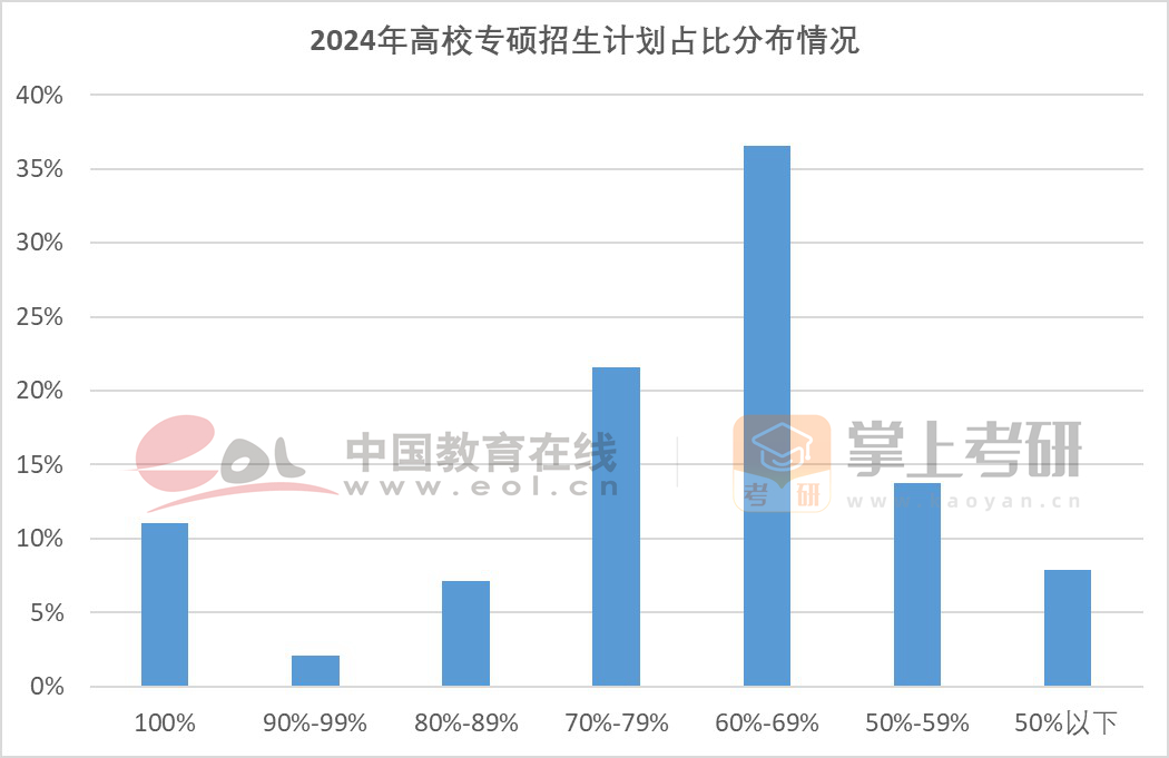 通過對今年662所高校(不含科研院所及黨校)碩士研究生統(tǒng)招計(jì)劃(不含推免計(jì)劃)統(tǒng)計(jì),只招收專碩的院校占比為11.03%,統(tǒng)招專碩計(jì)劃占比在60%以上的院校占比為78.4%,接近八成。而統(tǒng)招專碩計(jì)劃占比在50%以下的院校占比僅為7.85%。