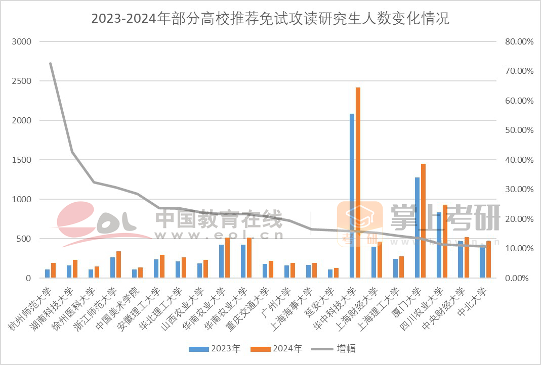 近年來,推免生受到高校與廣大研究生導(dǎo)師的歡迎,部分院校的推免招生數(shù)量也伴隨招生總量的增長,呈現(xiàn)出不斷增長趨勢。其中,雙非院校保研名額因?yàn)榛鶖?shù)較低,增幅更加明顯。杭州師范大學(xué)今年保研名額195人,較去年增加82人,增幅達(dá)到了72.57%。湖南科技大學(xué)今年保研名額234人,較去年增加70人,增幅達(dá)到了42.68%。