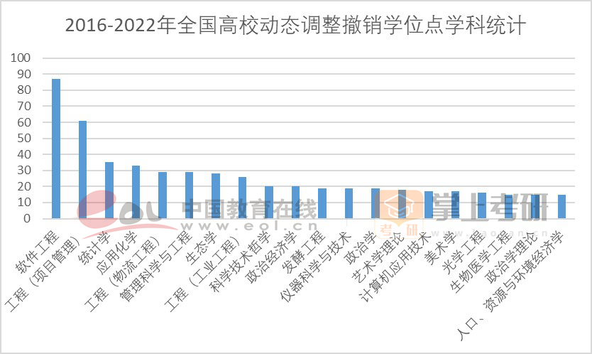 (注:圖表格統(tǒng)計時段為2016-2022年,表格僅展示7年撤銷數(shù)量≧15個的學(xué)位點學(xué)科。)