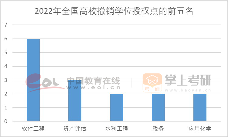 從撤銷的學(xué)位點來看,在2022年自主審核及動態(tài)調(diào)整撤銷的學(xué)位授權(quán)點名單中,共有32個學(xué)科的學(xué)位點被撤銷。其中,軟件工程被撤銷6個學(xué)位點;資產(chǎn)評估被撤銷3個學(xué)位點;水利工程、稅務(wù)和應(yīng)用化學(xué)被撤銷2個學(xué)位點。其他學(xué)科各被撤銷1個博士或碩士學(xué)位點。