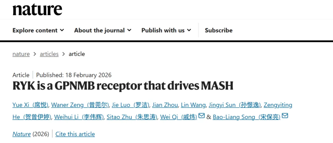 2月18日,武漢大學(xué)宋保亮院士團(tuán)隊在《自然》(Nature)雜志發(fā)表題為“RYK is a GPNMB receptor that drives MASH”的研究論文。該研究發(fā)現(xiàn)GPNMB-RYK新型配體-受體途徑介導(dǎo)MASH的發(fā)生發(fā)展,揭示肝細(xì)胞脂代謝重編程關(guān)鍵調(diào)控分子GPNMB,通過蛋白酶切割,生成功能形式的分泌型GPNMB胞外域(G-ECD),并首次鑒定單次跨膜蛋白RYK為G-ECD的功能性受體,通過增強(qiáng)肝脂攝取和合成,最終驅(qū)動MASLD/MASH。靶向GPNMB-RYK信號軸的多種治療策略,包括G-ECD疫苗、中和抗體、AAV-shRNA、GalNAC-siRNA均能有效地預(yù)防或治療MASLD/MASH。武漢大學(xué)生命科學(xué)學(xué)院、泰康生命醫(yī)學(xué)中心博士后席悅為第一作者,武漢大學(xué)復(fù)雜生命體代謝與調(diào)控全國重點(diǎn)實驗室、泰康生命醫(yī)學(xué)中心主任宋保亮院士和上??萍即髮W(xué)教授戚煒為共同通訊作者。