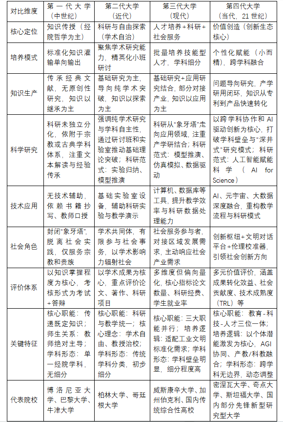 大學的形態(tài)演進始終是時代需求與文明進步的鏡像折射。作為人類文明傳承與知識創(chuàng)新的核心載體,大學與社會發(fā)展同頻共振的演進史,就是一部不斷回應時代訴求的歷史,相應的功能迭代亦清晰地勾勒出從神權社會到工業(yè)文明的知識權力變遷軌跡。從1088年意大利博洛尼亞大學開啟的第一代中世紀大學(知識傳授型),到1810年威廉·馮·洪堡創(chuàng)辦德國柏林大學確立的第二代近代大學(科研與教學統(tǒng)一型),再到1904年美國威斯康辛大學校長 查爾斯·范·海斯引領的第三代現(xiàn)代大學(人才培養(yǎng)、科研、社會服務三位一體型),每一代大學的出現(xiàn)都回應了特定時代的核心需求。