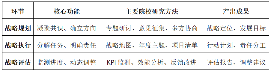 在“共同創(chuàng)造”模式中,戰(zhàn)略引領(lǐng)機(jī)制是實(shí)現(xiàn)院校研究從被動(dòng)響應(yīng)向主動(dòng)引領(lǐng)轉(zhuǎn)變的核心環(huán)節(jié)。該機(jī)制通過IR的專業(yè)介入與多元主體的協(xié)同參與,構(gòu)建了從戰(zhàn)略生成、傳導(dǎo)到評估的完整閉環(huán),形成了“證據(jù)驅(qū)動(dòng)、全員參與、持續(xù)優(yōu)化”的戰(zhàn)略治理新范式。