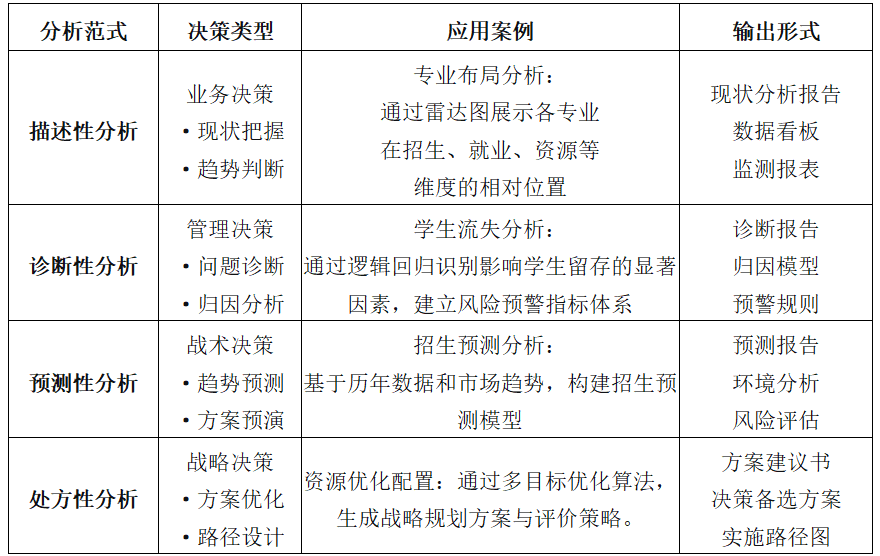 其三,院校研究分析范式逐步實(shí)現(xiàn)專業(yè)化進(jìn)階。從描述性分析、診斷性分析,到預(yù)測性分析與處方性分析,院校研究人員協(xié)同技術(shù)人員通過學(xué)業(yè)預(yù)警模型構(gòu)建、招生預(yù)測系統(tǒng)開發(fā)、資源優(yōu)化算法設(shè)計(jì)等實(shí)踐項(xiàng)目,在解決實(shí)際問題中實(shí)現(xiàn)分析能力的持續(xù)進(jìn)階。