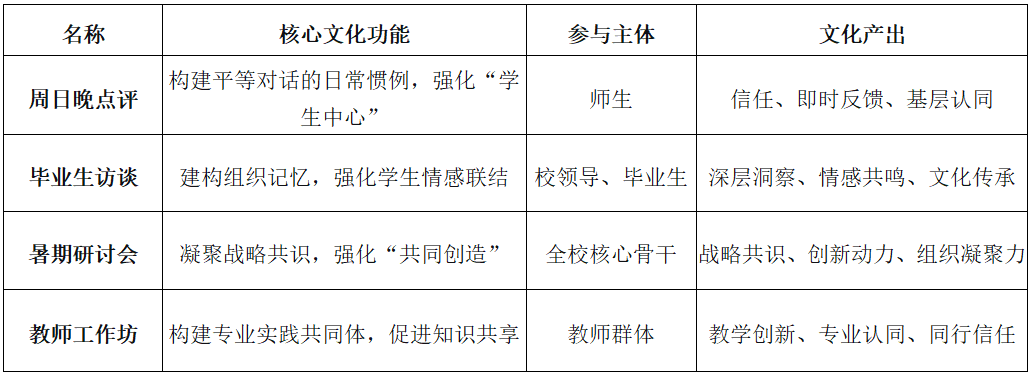 文化賦能機(jī)制構(gòu)成“共同創(chuàng)造”模式的深層支撐,通過系統(tǒng)化的文化建構(gòu)與制度性交流實(shí)踐,營造尊重專業(yè)價(jià)值、激勵(lì)協(xié)同創(chuàng)新的組織氛圍。時(shí)任校長劉獻(xiàn)君高度重視文化在院校研究中的基礎(chǔ)性作用,提出“共同目標(biāo)、共同創(chuàng)造、共同發(fā)展”的組織文化,在他的推動(dòng)下,文華學(xué)院建立了包括“周日晚點(diǎn)評”、“畢業(yè)生深度訪談”等在內(nèi)的制度性交流體系,為“共同創(chuàng)造”模式提供了深厚的文化支撐。