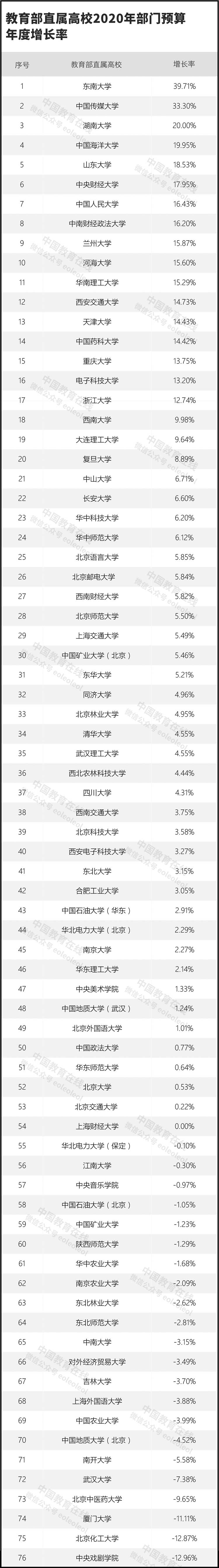 以下為教育部直屬高校2020年預算匯總及與2019年預算的對比: