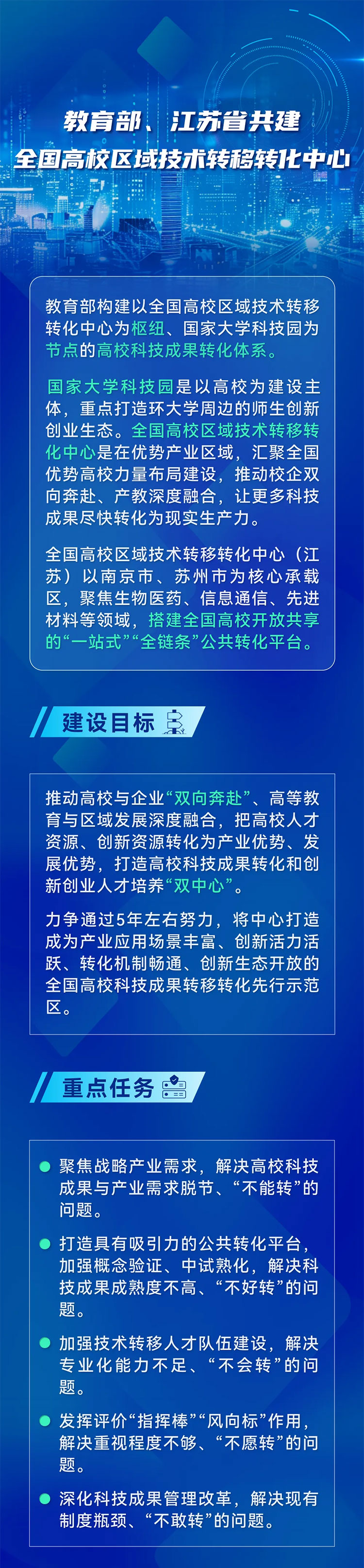 剛剛閉幕的全國(guó)教育大會(huì)對(duì)高校科技成果轉(zhuǎn)化作出重要部署,強(qiáng)調(diào)讓更多科技成果盡快轉(zhuǎn)化為現(xiàn)實(shí)生產(chǎn)力。9月14日,一項(xiàng)落實(shí)全國(guó)教育大會(huì)精神,劍指高??萍汲晒D(zhuǎn)化關(guān)鍵難題的重大舉措落地——教育部、江蘇省共建首個(gè)全國(guó)高校區(qū)域技術(shù)轉(zhuǎn)移轉(zhuǎn)化中心(以下簡(jiǎn)稱“區(qū)域中心”),拉開新時(shí)期推進(jìn)高??萍汲晒D(zhuǎn)化的序幕。一起來(lái)看一圖解讀——