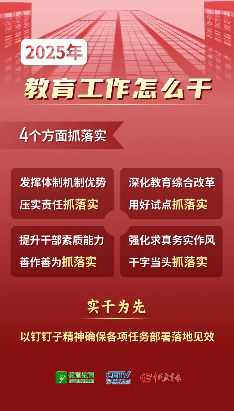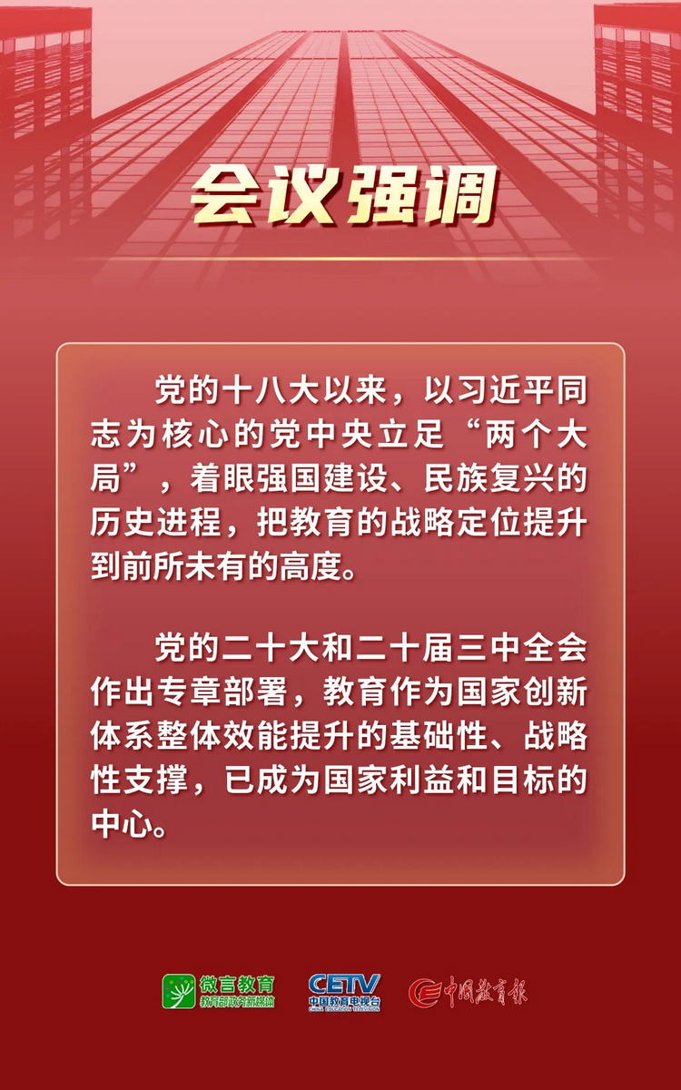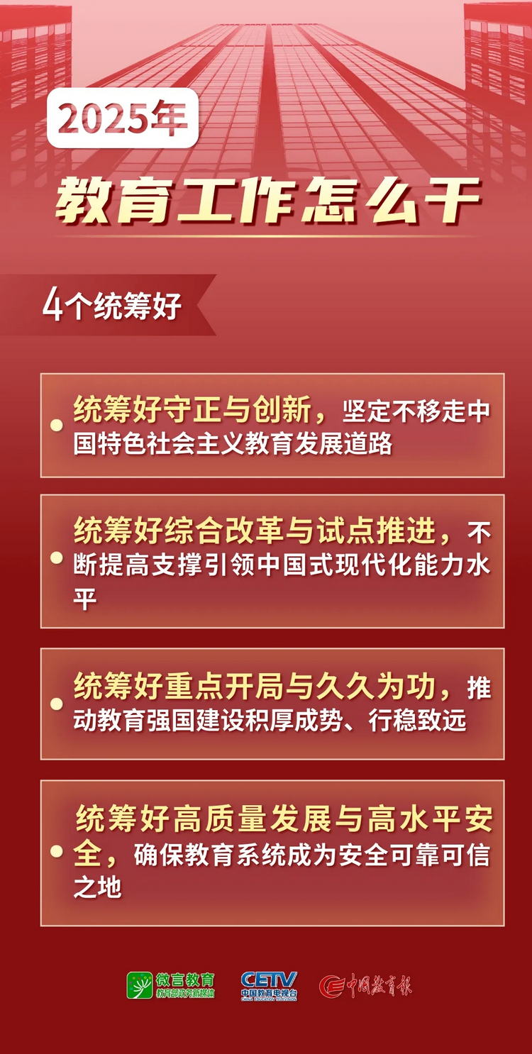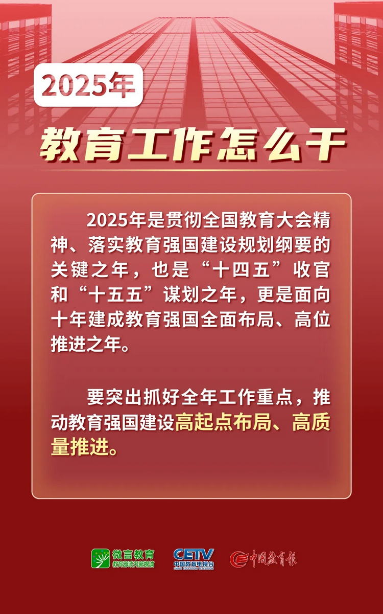 1月9日—10日,2025年全國教育工作會(huì)議在北京舉行。會(huì)議以習(xí)近平新時(shí)代中國特色社會(huì)主義思想為指導(dǎo),全面貫徹落實(shí)黨的二十大和二十屆二中、三中全會(huì)精神,深入學(xué)習(xí)貫徹全國教育大會(huì)精神和習(xí)近平總書記關(guān)于教育的重要論述,總結(jié)工作、分析形勢(shì),統(tǒng)一思想、凝聚共識(shí),圍繞組織實(shí)施教育強(qiáng)國建設(shè)規(guī)劃綱要,安排布置年度重點(diǎn)任務(wù),確保教育強(qiáng)國建設(shè)高起點(diǎn)布局、高質(zhì)量推進(jìn)。會(huì)上說了啥,組圖為你劃重點(diǎn)——