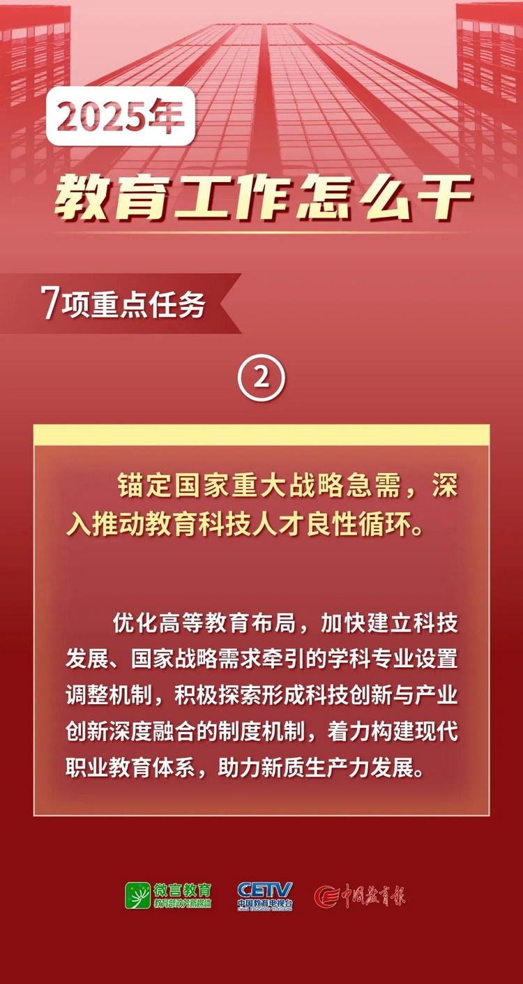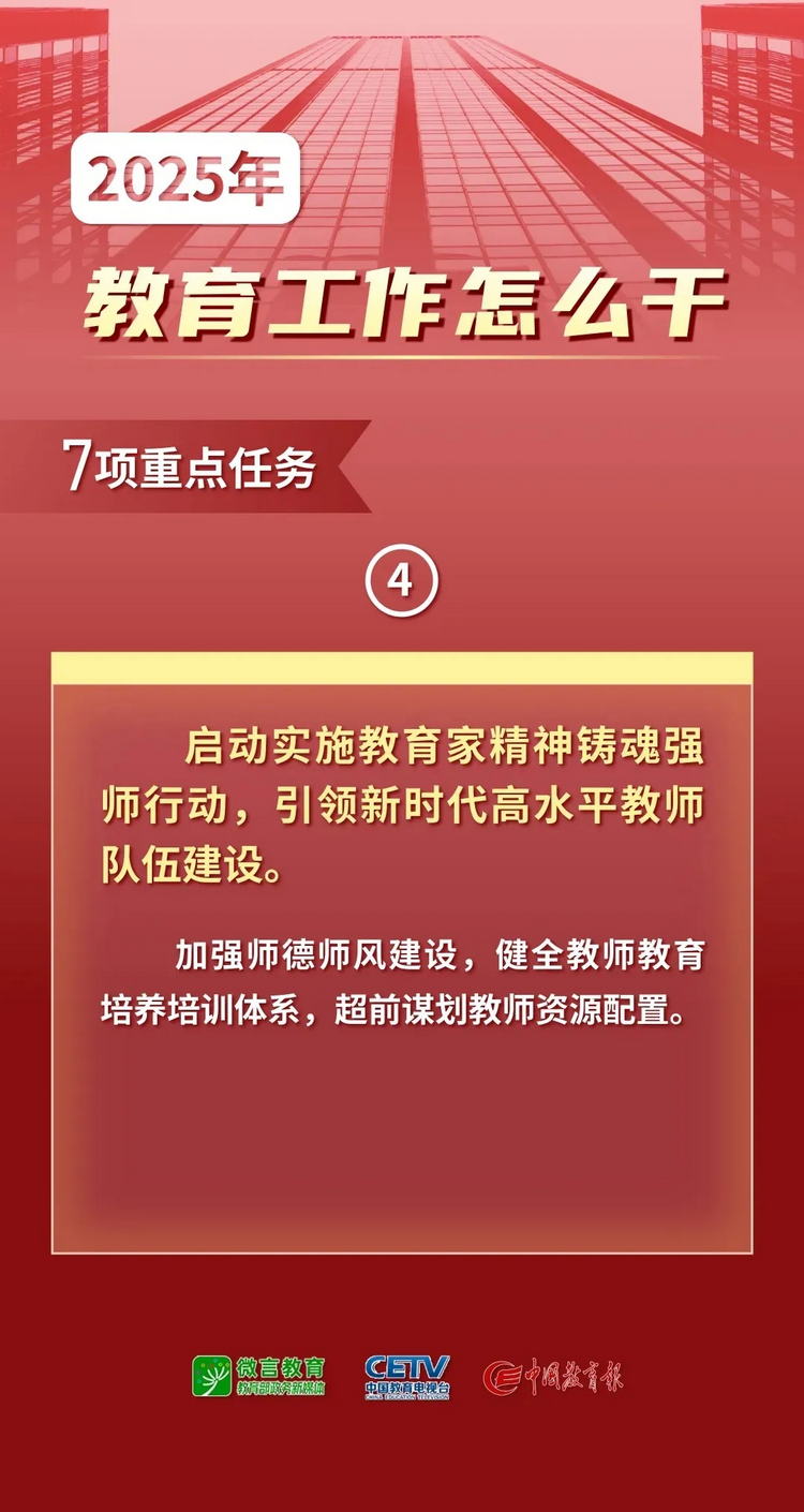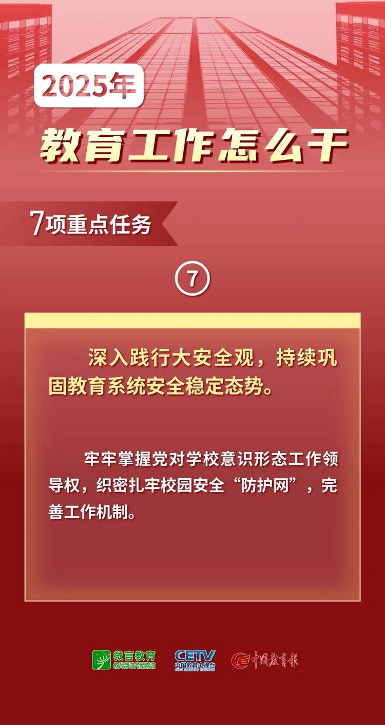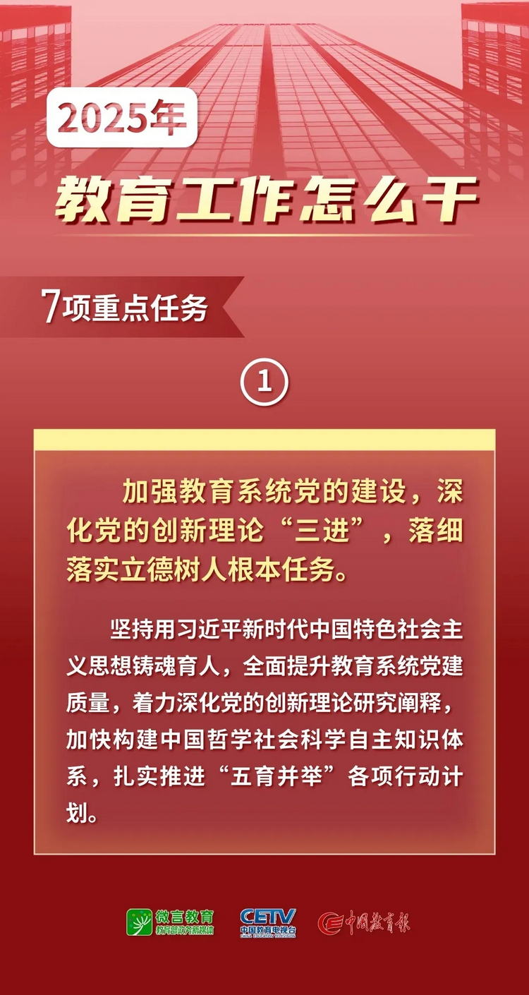 1月9日—10日,2025年全國教育工作會(huì)議在北京舉行。會(huì)議以習(xí)近平新時(shí)代中國特色社會(huì)主義思想為指導(dǎo),全面貫徹落實(shí)黨的二十大和二十屆二中、三中全會(huì)精神,深入學(xué)習(xí)貫徹全國教育大會(huì)精神和習(xí)近平總書記關(guān)于教育的重要論述,總結(jié)工作、分析形勢(shì),統(tǒng)一思想、凝聚共識(shí),圍繞組織實(shí)施教育強(qiáng)國建設(shè)規(guī)劃綱要,安排布置年度重點(diǎn)任務(wù),確保教育強(qiáng)國建設(shè)高起點(diǎn)布局、高質(zhì)量推進(jìn)。會(huì)上說了啥,組圖為你劃重點(diǎn)——