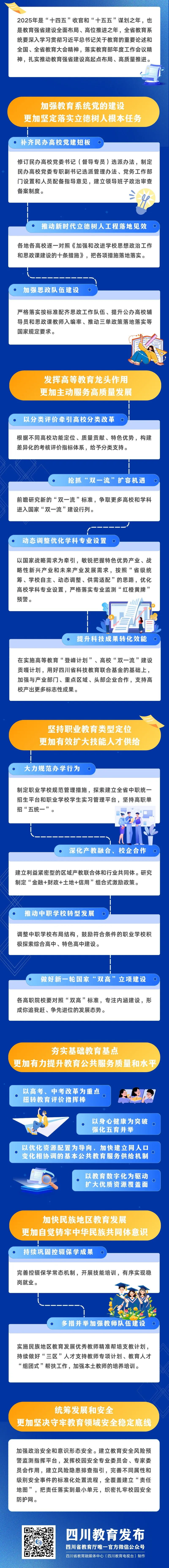 會議強調(diào),2025年是“十四五”收官和“十五五”謀劃之年,要在攻堅破難中緊抓關(guān)鍵,準(zhǔn)確把握教育強省建設(shè)的實踐路徑。要加強教育系統(tǒng)黨的建設(shè),補齊民辦高校黨建短板,實施新時代立德樹人工程,加強思政隊伍建設(shè),更加堅定落實立德樹人根本任務(wù)。要發(fā)揮高等教育龍頭作用,以分類評價牽引高校分類改革,搶抓“雙一流”擴容機遇,動態(tài)調(diào)整優(yōu)化學(xué)科專業(yè)設(shè)置,提升科技成果轉(zhuǎn)化效能,更加主動服務(wù)高質(zhì)量發(fā)展。要堅持職業(yè)教育類型定位,大力規(guī)范辦學(xué)行為,深化產(chǎn)教融合、校企合作,推動中職學(xué)校轉(zhuǎn)型發(fā)展,做好新一輪國家“雙高”立項建設(shè),更加有效擴大技能人才供給。要夯實基礎(chǔ)教育基點,以高考、中考改革為重點,扭轉(zhuǎn)教育評價指揮棒;以身心健康為突破,強化五育并舉;以優(yōu)化資源配置為導(dǎo)向,加快建立同人口變化相協(xié)調(diào)的基本公共教育服務(wù)供給機制;以教育數(shù)字化為驅(qū)動,擴大優(yōu)質(zhì)資源覆蓋面,更加有力提升教育公共服務(wù)質(zhì)量和水平。要加快民族地區(qū)教育發(fā)展,持續(xù)鞏固控輟保學(xué)成果,多措并舉加強教師隊伍建設(shè),更加自覺鑄牢中華民族共同體意識。要統(tǒng)籌發(fā)展和安全,提升安全工作專業(yè)性、預(yù)見性,把責(zé)任落實到最小單元,確保政治安全和意識形態(tài)安全,更加堅決守牢教育領(lǐng)域安全穩(wěn)定底線。