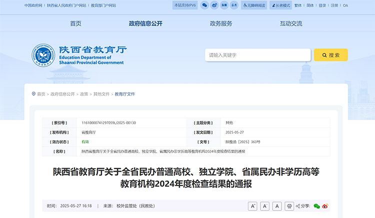 近日,陜西省教育廳發(fā)布關(guān)于全省民辦普通高校、獨(dú)立學(xué)院、省屬民辦非學(xué)歷高等教育機(jī)構(gòu)2024年度檢查結(jié)果的通報(bào)。
