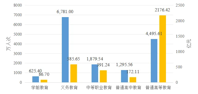 學前教育資助財政資金投入80.21億元,占學前教育資助資金總額的92.51%;義務教育資助財政資金投入581.73億元,占義務教育資助資金總額的99.33%;中等職業(yè)教育資助財政資金投入385.63億元,占中等職業(yè)教育資助資金總額的98.57%;普通高中教育資助財政資金投入160.23億元,占普通高中教育資助資金總額的93.10%;普通高等教育資助財政資金投入1007.91億元,占普通高等教育資助資金總額的46.31%。