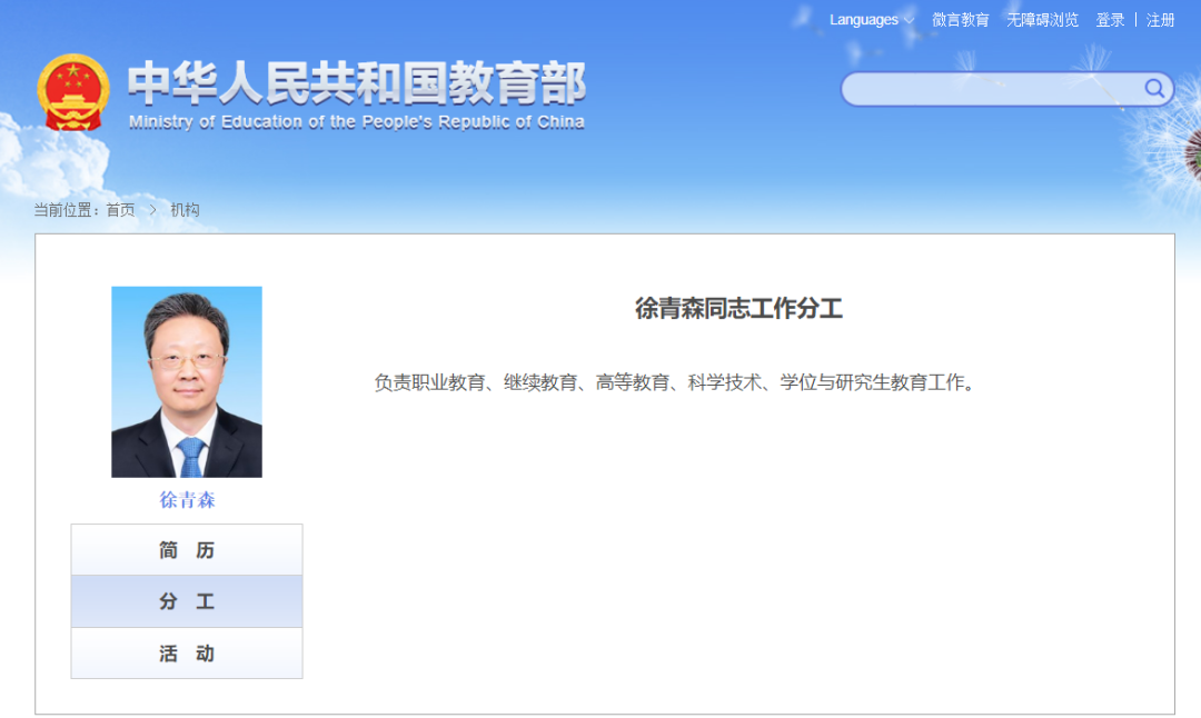 近日,教育部官網(wǎng)更新了教育部領(lǐng)導(dǎo)的分工,徐青森副部長(zhǎng)分管職業(yè)教育、繼續(xù)教育、高等教育、科學(xué)技術(shù)、學(xué)位與研究生教育工作。