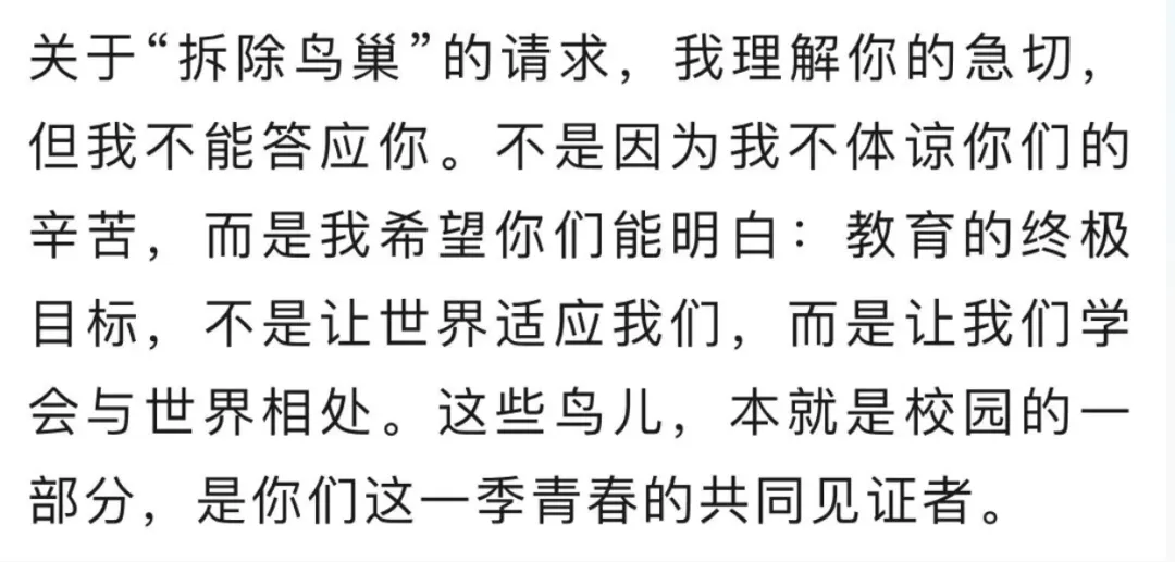 起因是一名高三同學(xué),因被鳥兒鳴叫影響備考,向校長(zhǎng)寫信提出拆毀鳥窩。這位校長(zhǎng)拒絕了他的訴求。在接受采訪時(shí)他解釋,今天是嫌鳥兒吵,明天就可能覺得空調(diào)聲、滴水聲都吵,我們需要學(xué)會(huì)和這個(gè)世界相處,而不是讓世界適應(yīng)我們。
