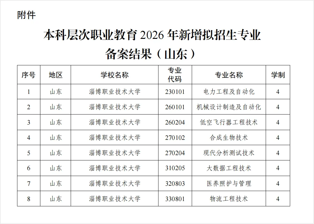 近日,教育部辦公廳公布2026年本科層次職業(yè)教育專業(yè)設(shè)置備案結(jié)果,淄博職業(yè)技術(shù)大學(xué)申報的電力工程及自動化、機械設(shè)計制造及自動化、低空飛行器工程技術(shù)、合成生物技術(shù)、現(xiàn)代分析測試技術(shù)、大數(shù)據(jù)工程技術(shù)、醫(yī)養(yǎng)照護與管理、物流工程技術(shù)等8個四年制職業(yè)本科專業(yè)獲批。