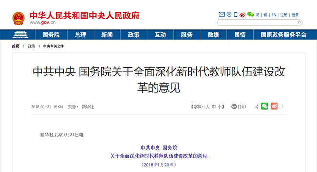 2018年1月20日,中共中央、國(guó)務(wù)院印發(fā)《關(guān)于全面深化新時(shí)代教師隊(duì)伍建設(shè)改革的意見(jiàn)》,提出要“不斷提高地位待遇,真正讓教師成為令人羨慕的職業(yè)”。