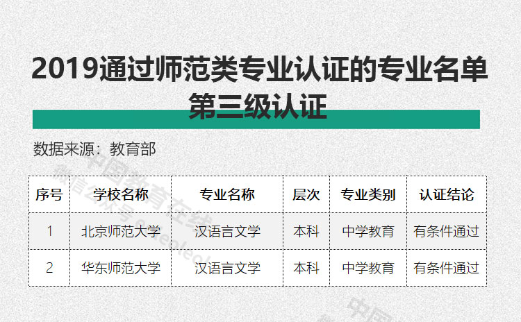 教育部公布的2019年通過(guò)普通高等學(xué)校師范類(lèi)專(zhuān)業(yè)認(rèn)證的專(zhuān)業(yè)名單中,北京師范大學(xué)及華東師范大學(xué)的漢語(yǔ)言文學(xué)專(zhuān)業(yè)分別通過(guò)第三級(jí)專(zhuān)業(yè)認(rèn)證。(備注:通過(guò)第三級(jí)認(rèn)證的專(zhuān)業(yè),在認(rèn)證結(jié)論有效期內(nèi)入學(xué)的師范生,可由高校自行組織中小學(xué)教師資格考試筆試和面試工作。)