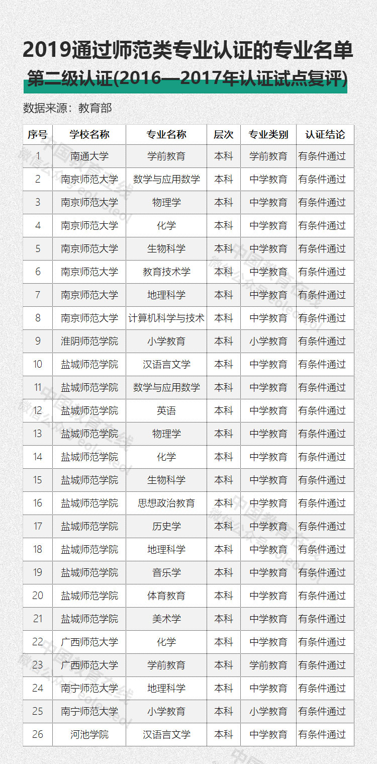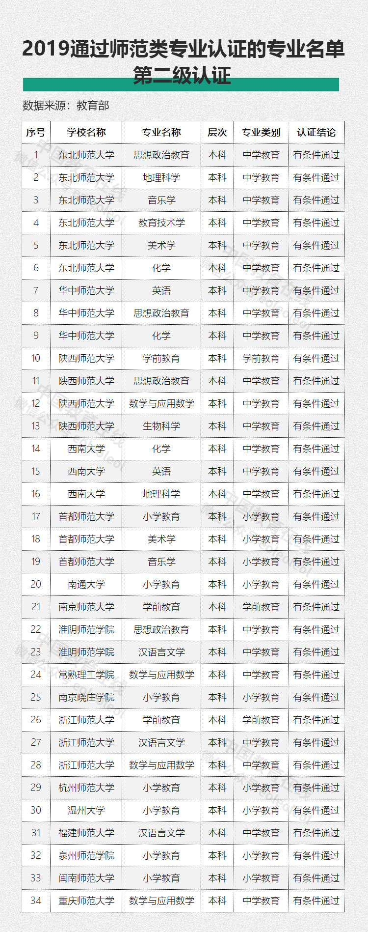 東北師范大學(xué)、華中師范大學(xué)等17所高校的34個(gè)專(zhuān)業(yè)通過(guò)第二級(jí)專(zhuān)業(yè)認(rèn)證。(備注:通過(guò)第二級(jí)認(rèn)證的專(zhuān)業(yè),在認(rèn)證結(jié)論有效期內(nèi)入學(xué)的師范生,可由高校自行組織中小學(xué)教師資格考試面試工作。)