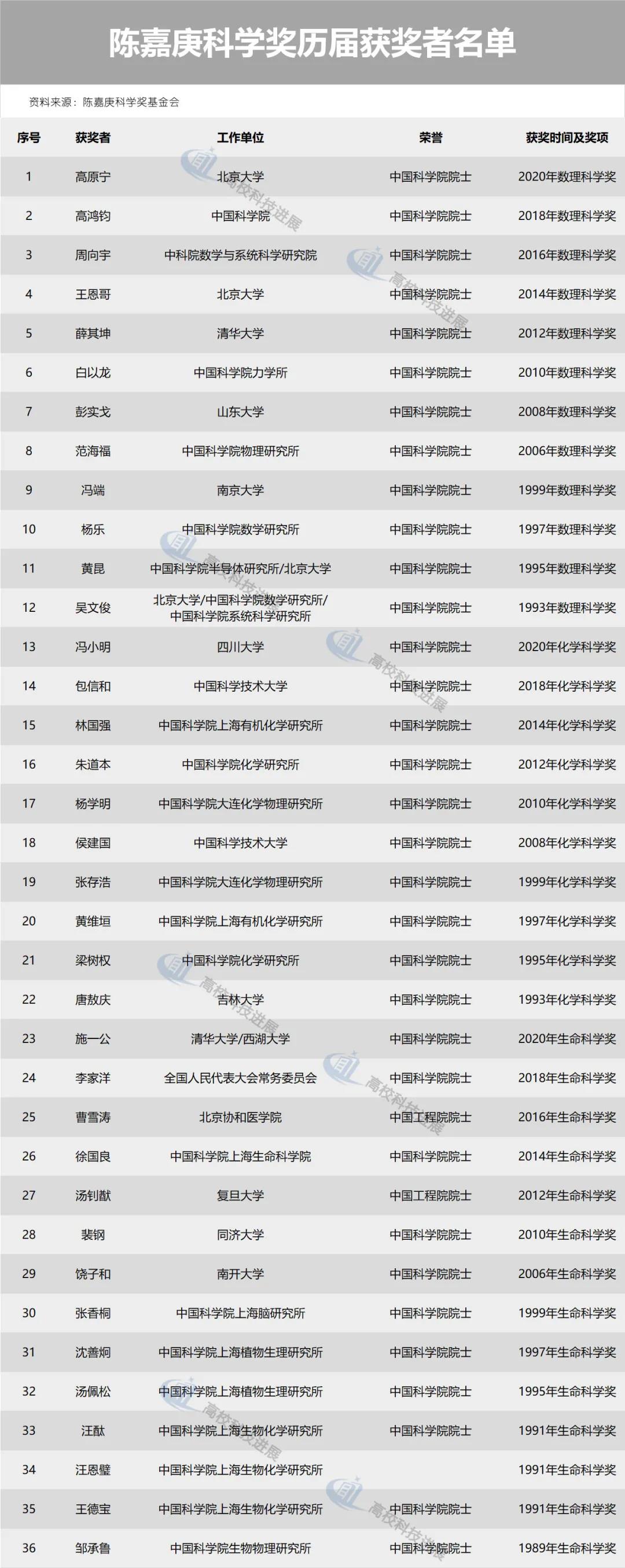 根據(jù)《陳嘉庚科學獎基金會關于2020年度陳嘉庚科學獎和陳嘉庚青年科學獎獎勵的決定》,共有5位科學家獲得陳嘉庚科學獎,6位青年才俊獲得陳嘉庚青年科學獎。