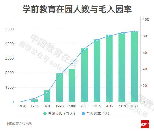 1950年,我國(guó)幼兒園數(shù)1799所,在園幼兒僅為14萬(wàn)人,毛入園率0.4%。