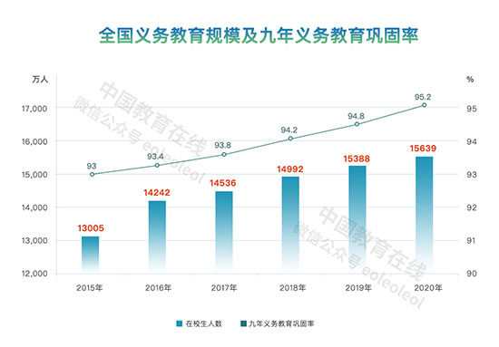 2015年,全國(guó)共有義務(wù)教育階段在校生1.3億人,義務(wù)教育鞏固率為93%,到2020年,全國(guó)共有義務(wù)教育階段在校生1.56億人,九年義務(wù)教育鞏固率95.2%,比2015年提高了2.2個(gè)百分點(diǎn)。