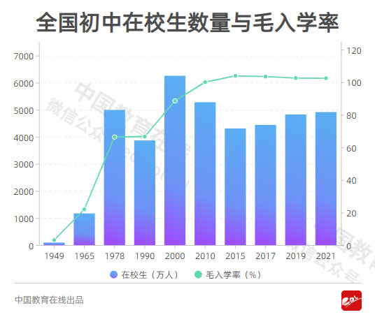 建國(guó)初期的中國(guó),中學(xué)在校生不超過(guò)100萬(wàn)人,為95萬(wàn)人,毛入學(xué)率3.1%。1978年,全國(guó)初中在校生人數(shù)達(dá)到4995萬(wàn)人,毛入學(xué)率66.4%。