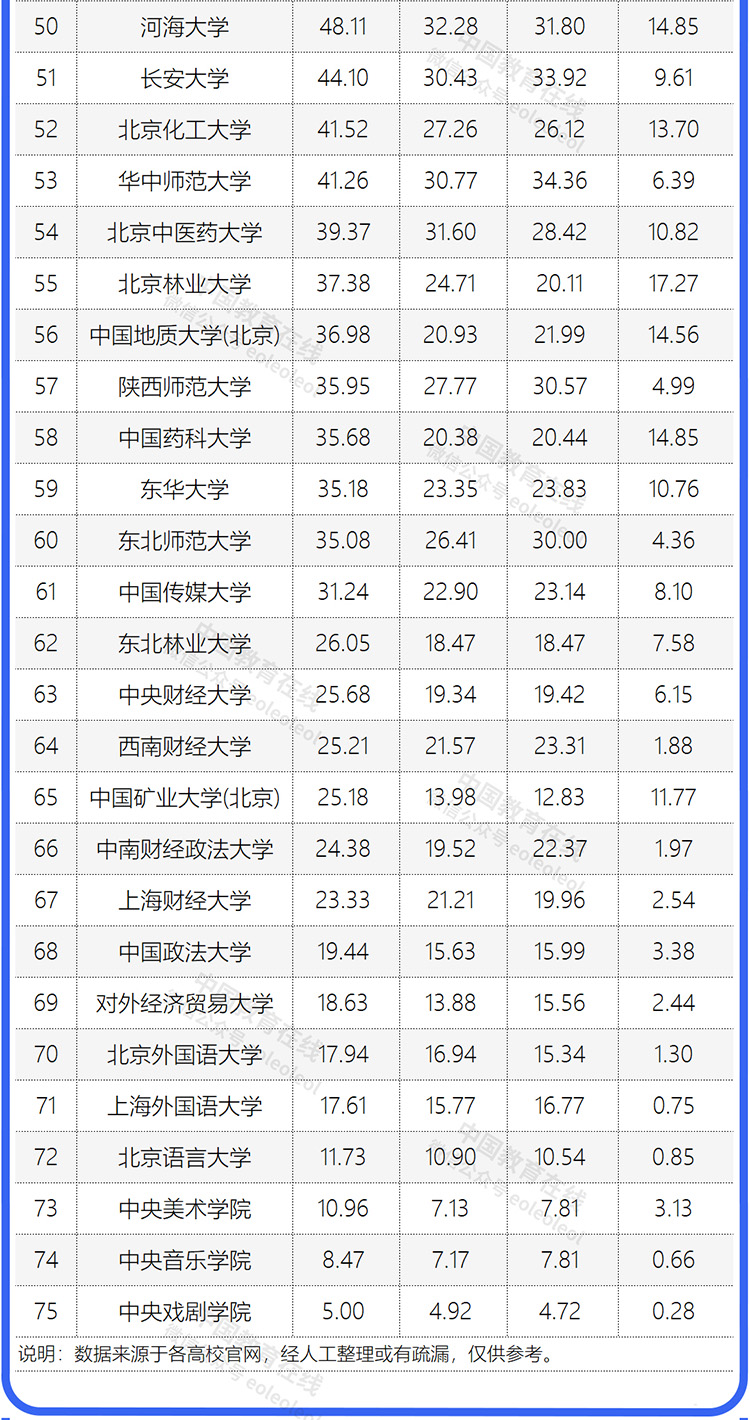 說明:本文統(tǒng)計中,華北電力大學經(jīng)費為北京校區(qū)和保定校區(qū)合計,哈爾濱工業(yè)大學、北京航空航天大學、西北工業(yè)大學等工信部直屬高校以及國科大、中科大等中國科學院直屬高校以及其他部委院校不在本文的統(tǒng)計范圍之內(nèi)。
