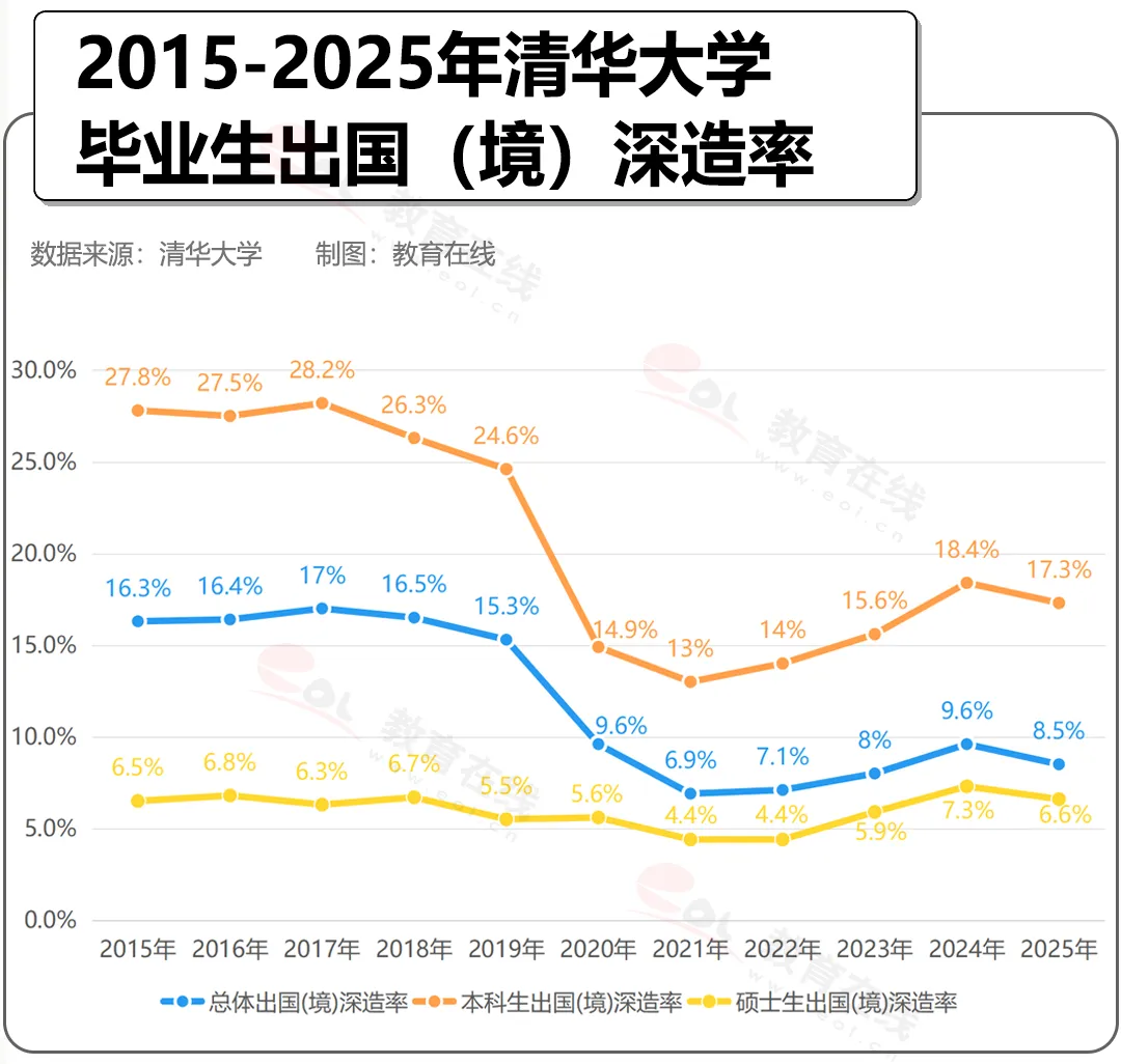 近日,清華大學(xué)公布2025屆畢業(yè)生去向情況。一組數(shù)據(jù)刷屏全網(wǎng):2025屆畢業(yè)生出國(guó)(境)深造比例8.5%。近十年,清華畢業(yè)生平均出國(guó)(境)深造比例為10.0%。