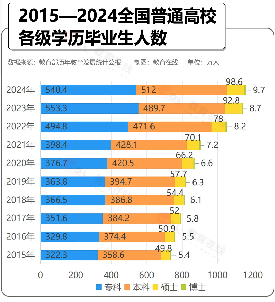 過去10年,中國高校畢業(yè)生規(guī)模發(fā)生了明顯的量變。2015年,全國普通本??萍把芯可厴I(yè)生約736萬人;到2024年,這一數(shù)字已經(jīng)達(dá)到1160萬人。十年間增加424萬人,整體規(guī)模擴(kuò)大約58%。