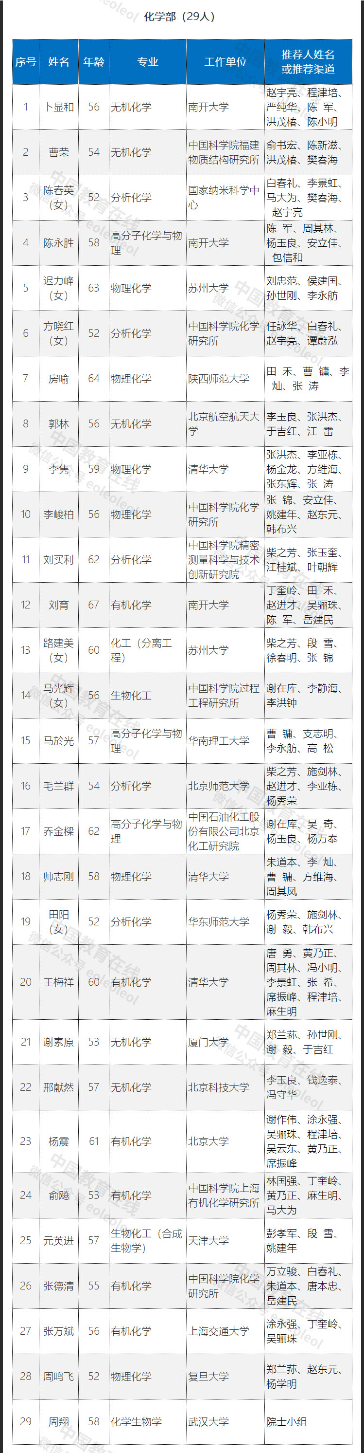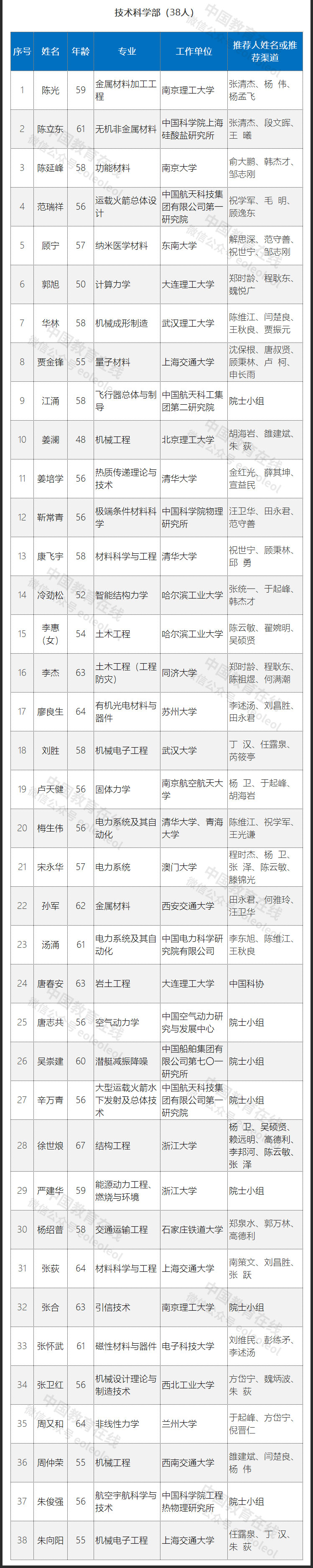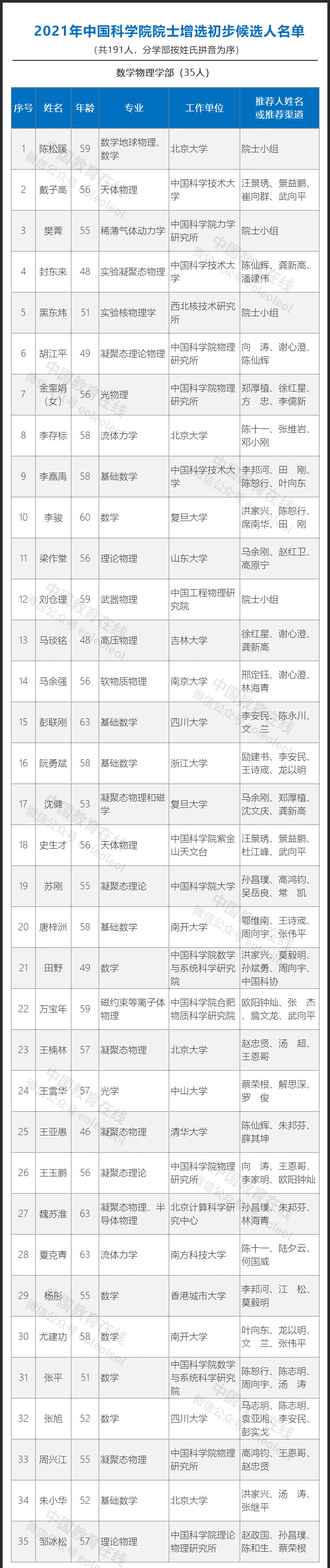 此次入圍的初步候選人共計191人,其中數(shù)學物理學部35人,化學部29人,生命科學和醫(yī)學學部36人,地學部27人,信息技術科學部26人,技術科學部38人。具體名單如下: