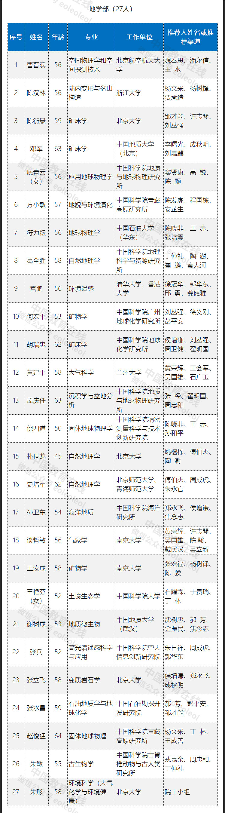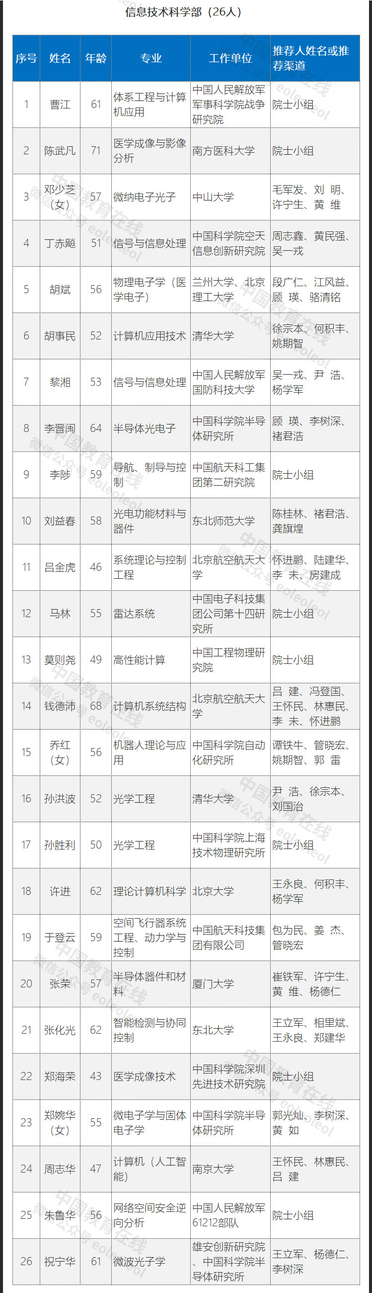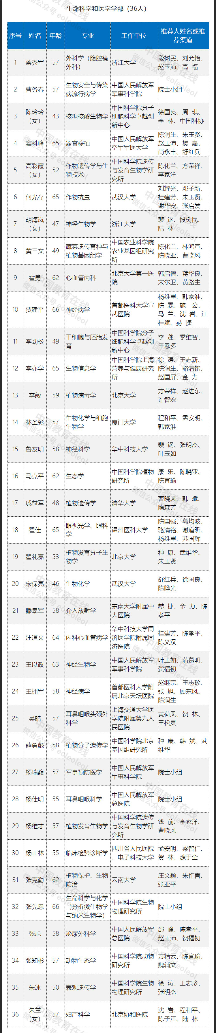 此次入圍的初步候選人共計191人,其中數(shù)學物理學部35人,化學部29人,生命科學和醫(yī)學學部36人,地學部27人,信息技術科學部26人,技術科學部38人。具體名單如下: