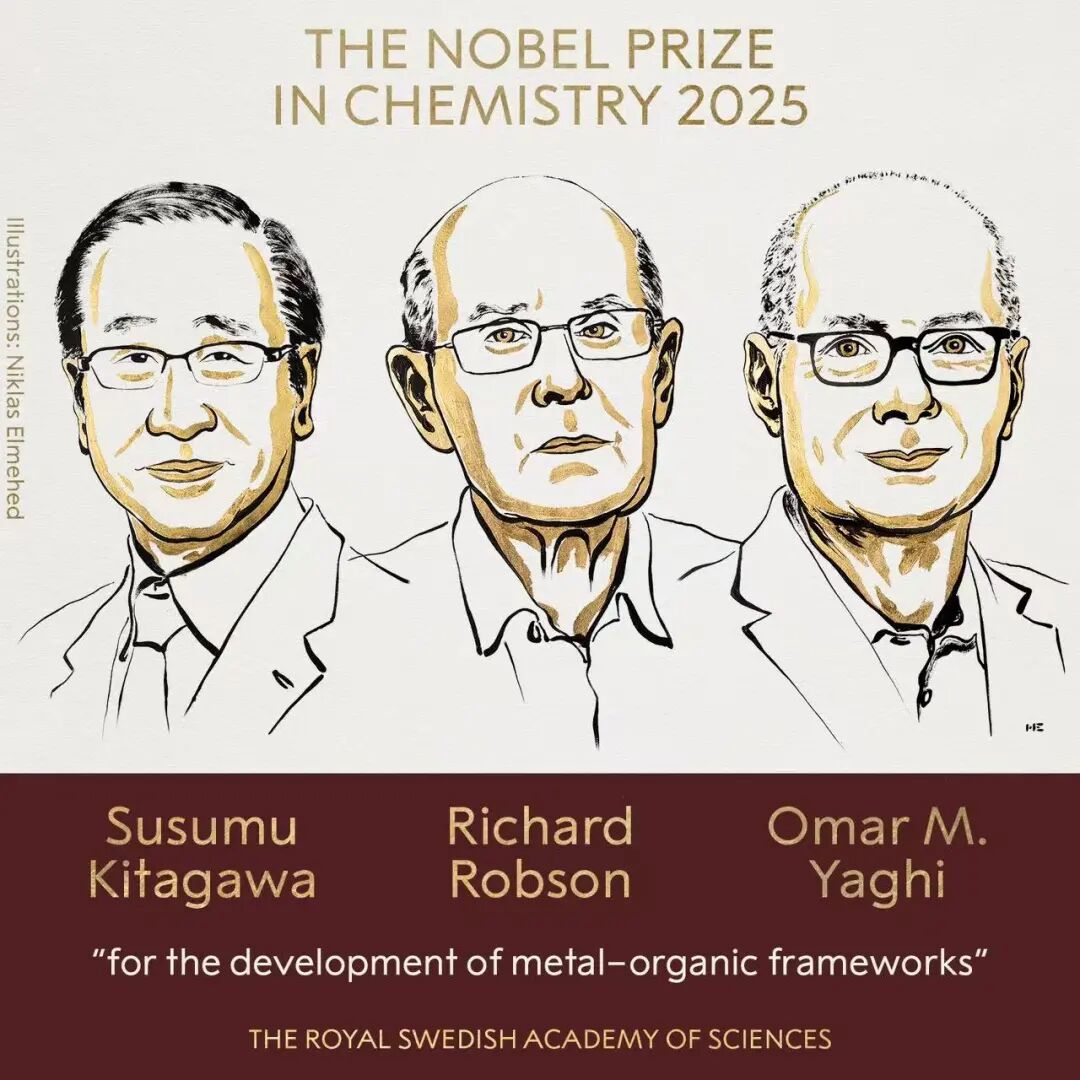 北京時間10月8日,2025年諾貝爾化學(xué)獎揭曉獲獎名單,瑞典皇家科學(xué)院宣布,將2025年諾貝爾化學(xué)獎授予北川進(Susumu Kitagawa),理查德·羅布森 (Richard Robson)和奧馬爾·M·亞吉(Omar M. Yaghi) ,以表彰他們“在金屬有機框架領(lǐng)域的發(fā)展”。獲獎獎金為1100萬瑞典克朗。
